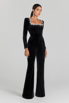 The Kristine Noir Jumpsuit is made for unforgettable entrances and timeless style. With its square neckline, shoulder pads, and supportive inner structure, this piece beautifully contours the figure. The black velvet effect and jewel embellishments bring depth and sophistication to the design, while the flared pants elongate the silhouette.