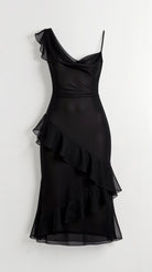 The 'Zephyra' gown is dark romance personified. This enchanting piece features a figure-skimming silhouette with cascading ruffles that create dramatic movement, while the daring high slit and sheer panels add alluring mystery. The cowl neckline and fitted bodice ensure a flawless fit.